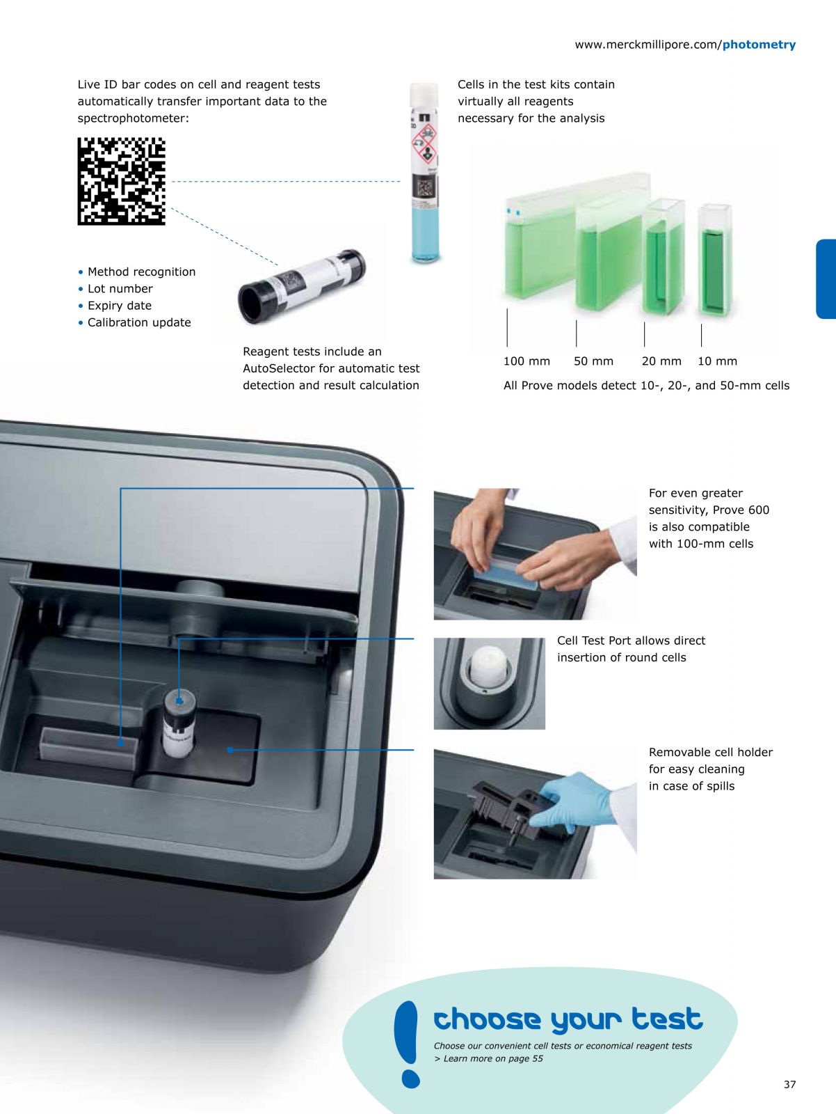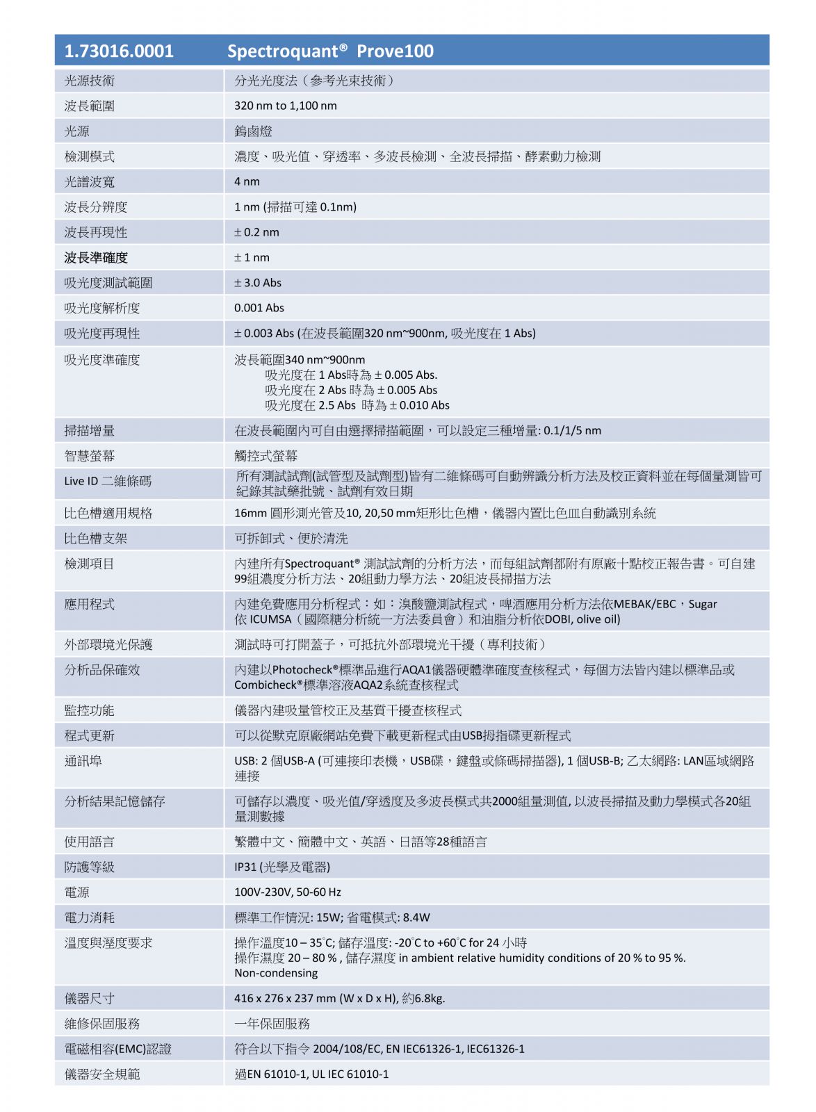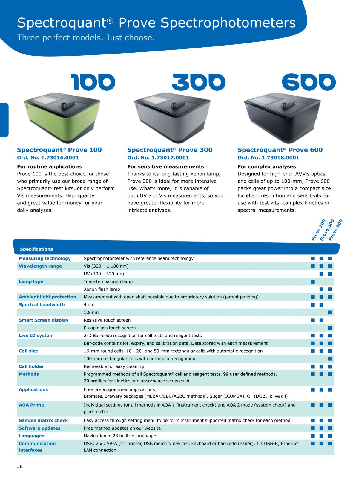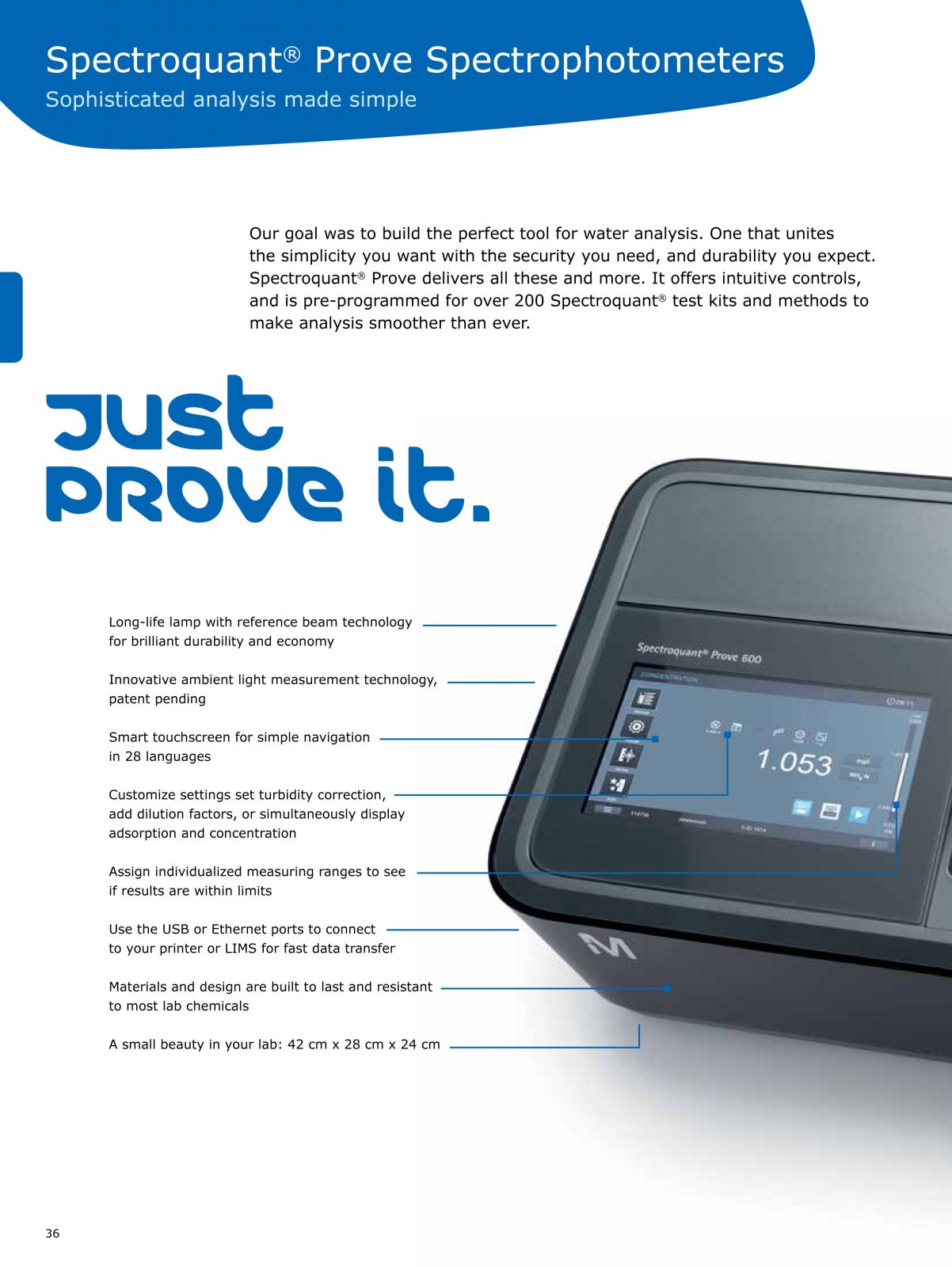 The Spectroquant® Prove 100 is the best choice for those who primarily use our broad range of Spectroquant® Test Kits, or only perform Vis measurements. The Spectroquant® Prove 100 provides high quality and great value for money for your daily analyses. The Spectroquant® Prove family is our series of cutting edge spectrophotometers for easy analysis of water, food and beverage, and environmental samples. All Spectroquant® Prove instruments are pre-programmed for over 200 Test Kits and automatic bar code recognition ensures the correct method parameters are applied and all essential information such as lot number, expiry date, and automatic calibration updates are recorded, making the use of analytical Test Kits as easy as never before. |