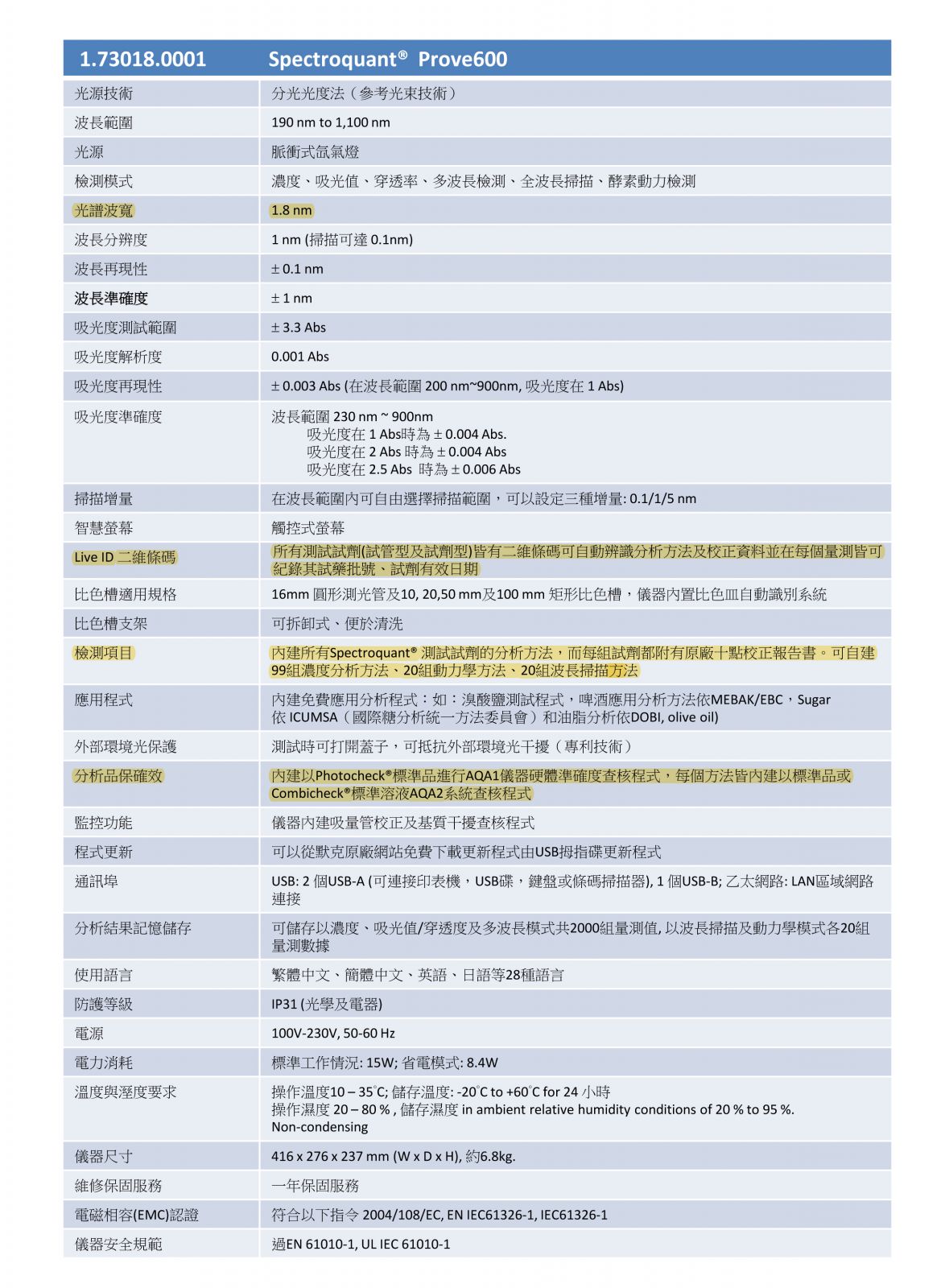 Equipped with high-end UV/Vis optics, and the capability to hold cells of up to 100 mm, the Spectroquant® Prove 600 packs great power into a compact size. The Spectroquant® Prove 600 delivers excellent resolution and sensitivity for use with test kits, complex kinetics or spectral measurements. The Spectroquant® Prove family is our series of cutting edge spectrophotometers for easy analysis of water, food and beverage, and environmental samples. All Spectroquant® Prove instruments are pre-programmed for over 200 Test Kits and automatic bar code recognition ensures the correct method parameters are applied and all essential information such as lot number, expiry date, and automatic calibration updates are recorded, making the use of analytical Test Kits as easy as never before. |