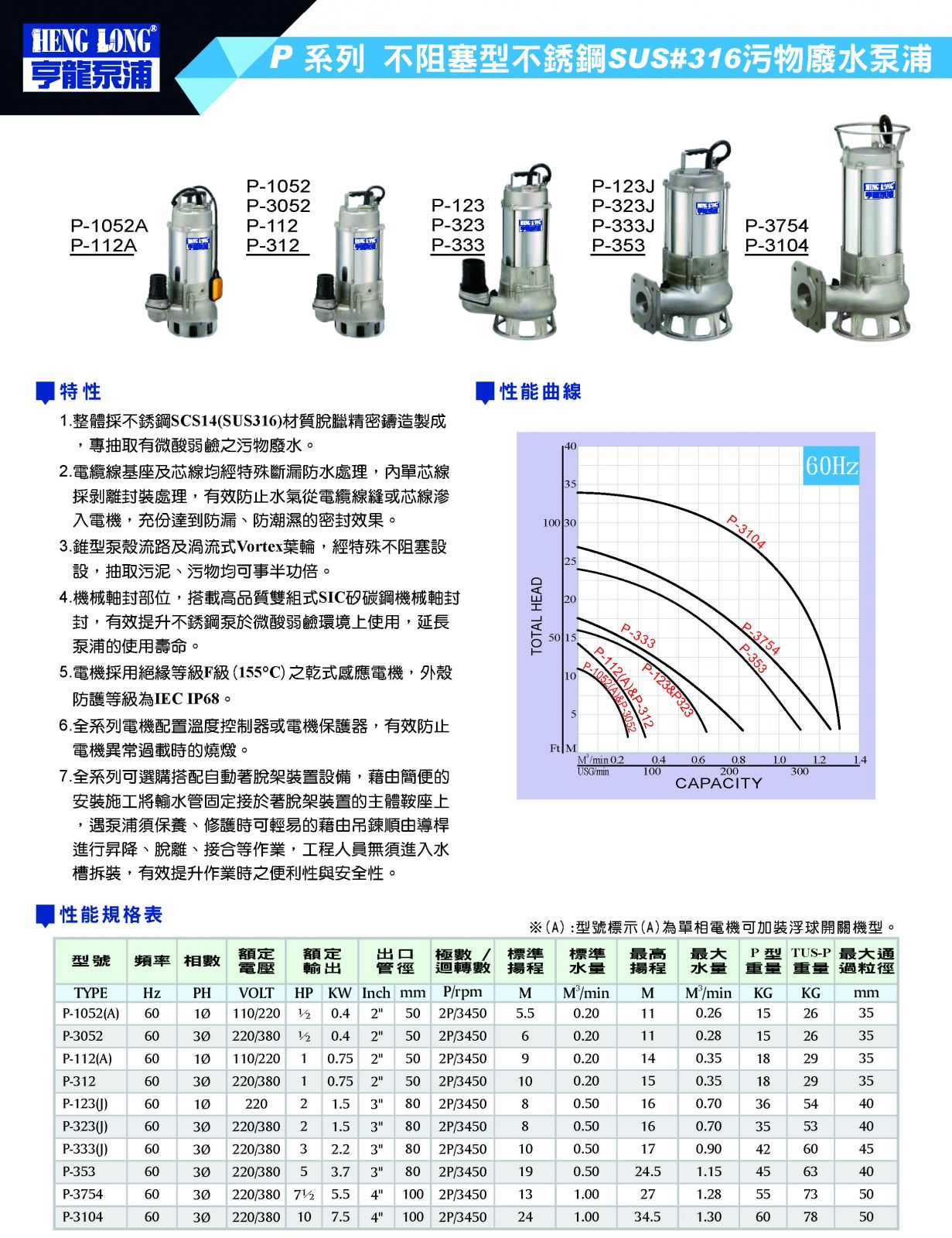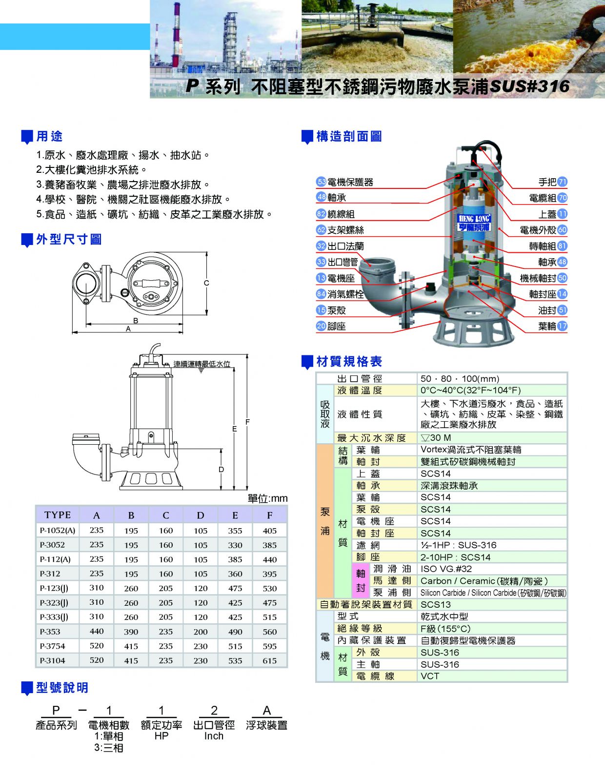 P 系列 不阻塞型不銹鋼SUS#316污物廢水泵浦