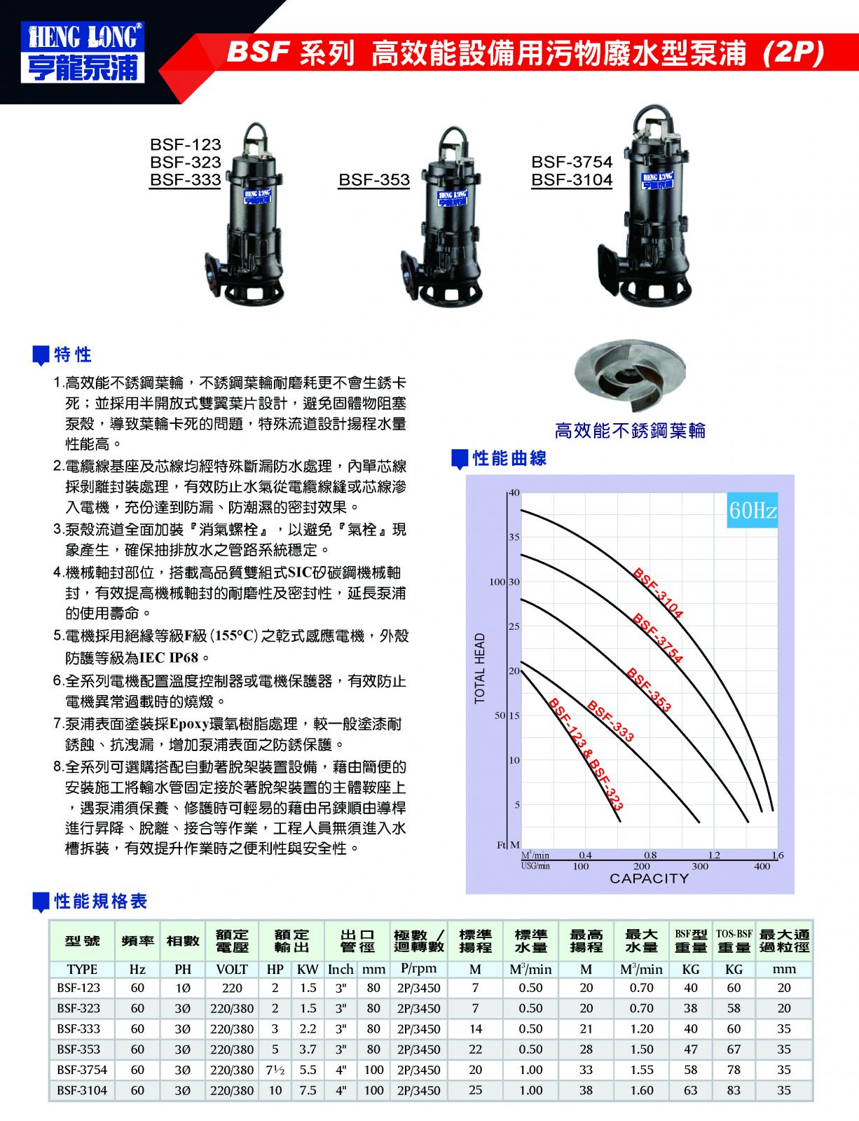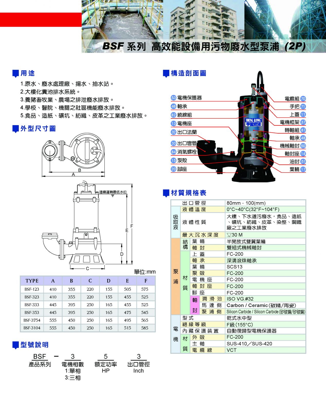 BSF 系列 高效能設備用污物廢水型泵浦 (2P)